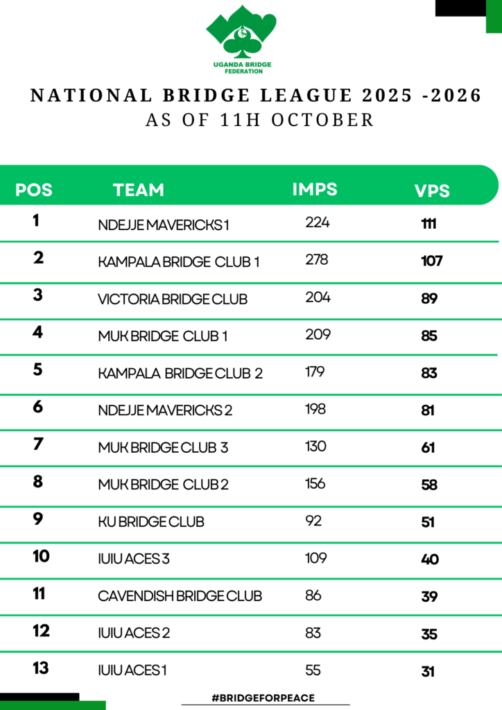 Defending champions Muk Bridge Club 1, captained by Asiimwe Kizza, endured a rollercoaster: a crushing 25-1 VP morning loss to Kampala Bridge Club 1marked by faltered defenses and missed slams followed by a 21-9 mid-morning defeat to Kampala Bridge Club 2. They salvaged pride with a 25-4 afternoon thrashing of Muk Bridge Club 3, but the damage dropped them to fourth (85 VPs). “It was a wake-up call,” said Asiimwe Kizza the Muk Bridge Club Captain in a post-match talk. “We’ll rebound stronger. Ndejje Mavericks 1 seized the summit with flawless morning (25 VPs over IUIU Aces 1) and mid-morning (25 VPs over Muk Bridge Club 3) wins, before a gritty 17-13 afternoon slip to Victoria Bridge Club, who surged to third (89 VPs). Kampala Bridge Club 1’s upset heroics propelled them to second (107 VPs), just four VPs behind Ndejje’s 111.Cavendish Bridge Club climbed from 13th to 11th (39 VPs), a beacon for newcomers, while IUIU’s Aces squads anchored the bottom, reflecting the league’s developmental edge.
